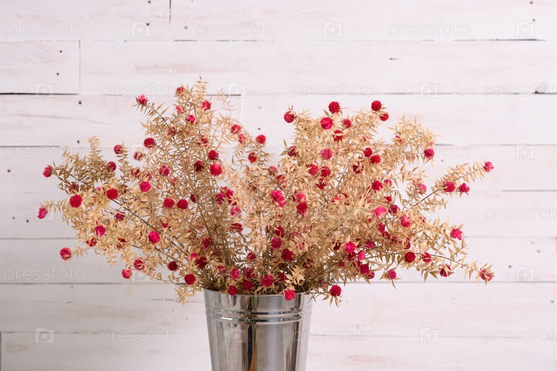 Концепция украшения дома: сушеные луговые цветы в металлическом горшке на светлом фоне деревянной стены. Место для надписи