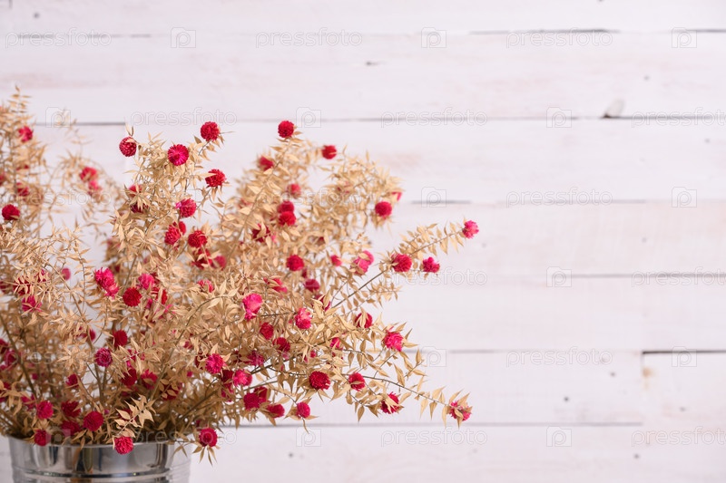 Концепция украшения дома: сушеные луговые цветы в металлическом горшке на светлом фоне деревянной стены. Место для надписи