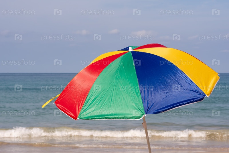 Разноцветный пляжный зонтик на фоне солнца на пляже