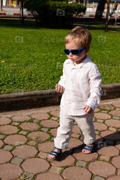 Маленький мальчик в белой рубашке и синих очках идет с камнем в руках