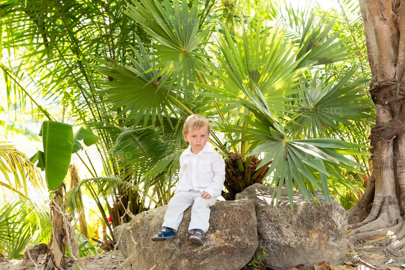 Маленький светловолосый мальчик в белой одежде сидит на камне под тропическими деревьями