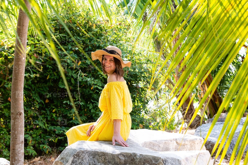 Молодая девушка в желтом платье и шляпе сидит на большом камне под пальмой