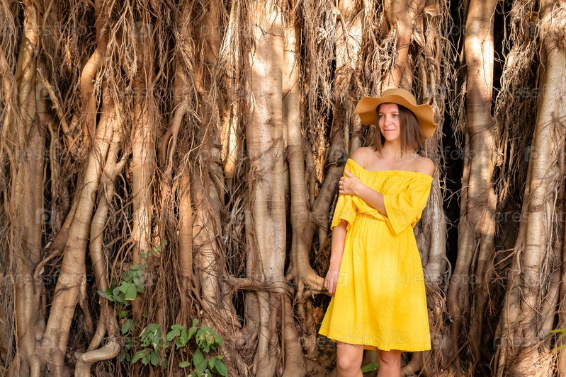 Девушка в желтом платье и шляпе на фоне тропического леса