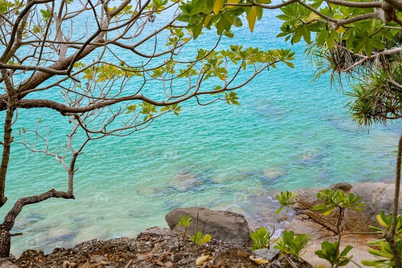 Вид на голубую морскую воду и камни сквозь ветви деревьев