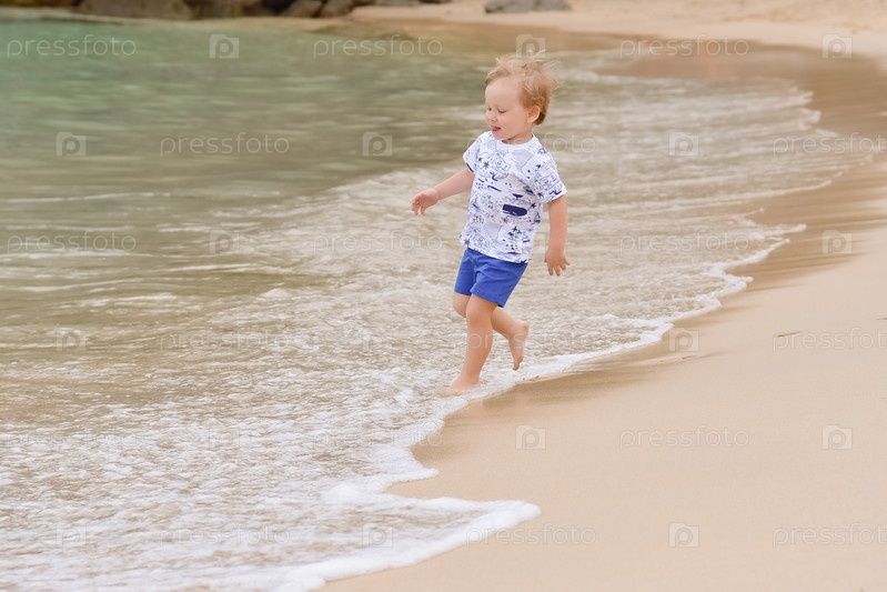 Маленький светловолосый мальчик бежит по воде вдоль морского пляжа