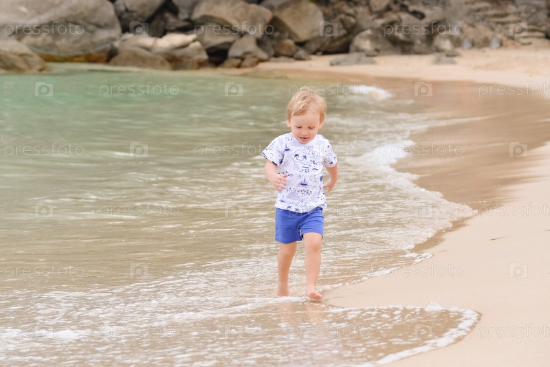 Маленький светловолосый мальчик бежит по воде вдоль морского пляжа