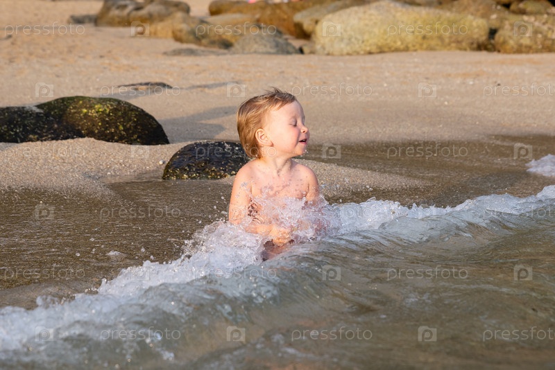 Маленький мальчик сидит на пляже в воде