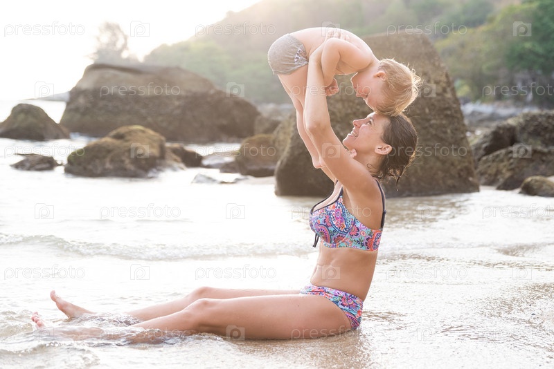 Мать с ребенком на морском пляже на фоне моря и камней
