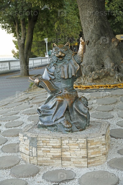 Скульптура "Кот Ученый", за скульптурой дуб, златая цепь на дубе том. Набережная город Геленджик