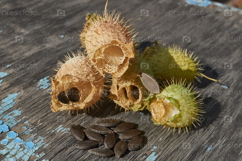 Сухие плоды эхиноцистиса с раскрытыми оболочками и семенами на деревянной поверхности. монотипный род однолетних травянистых растений семейства Тыквенные