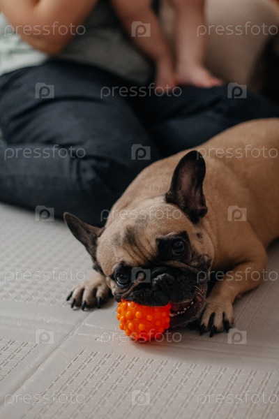 Собака французский бульдог лежит на полу с игрушкой и грезет