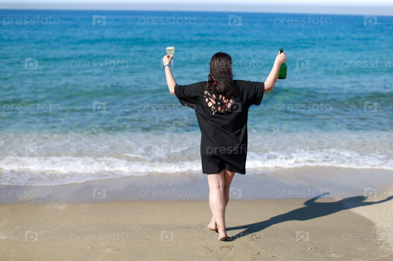 Брюнетка с бутылкой и бокалом шампанского стоит на берегу моря