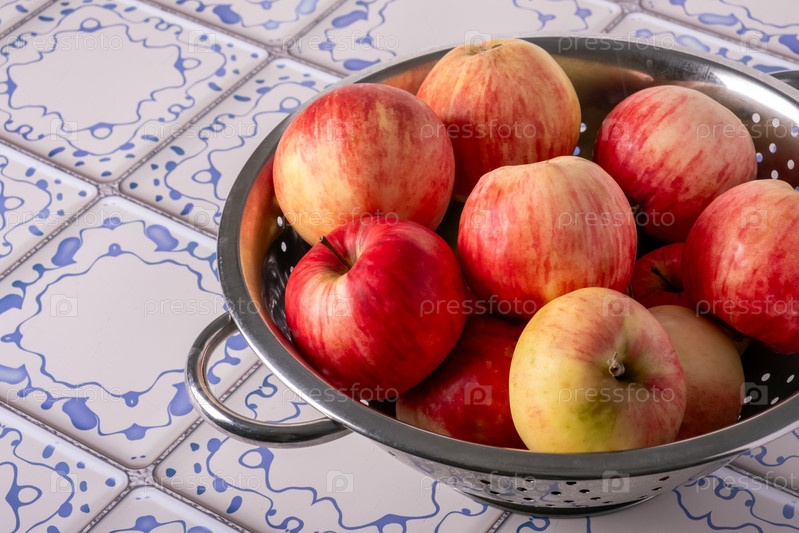 Красные яблоки лежат в металлическом дуршлаге на столе с сине-белой плиткой
