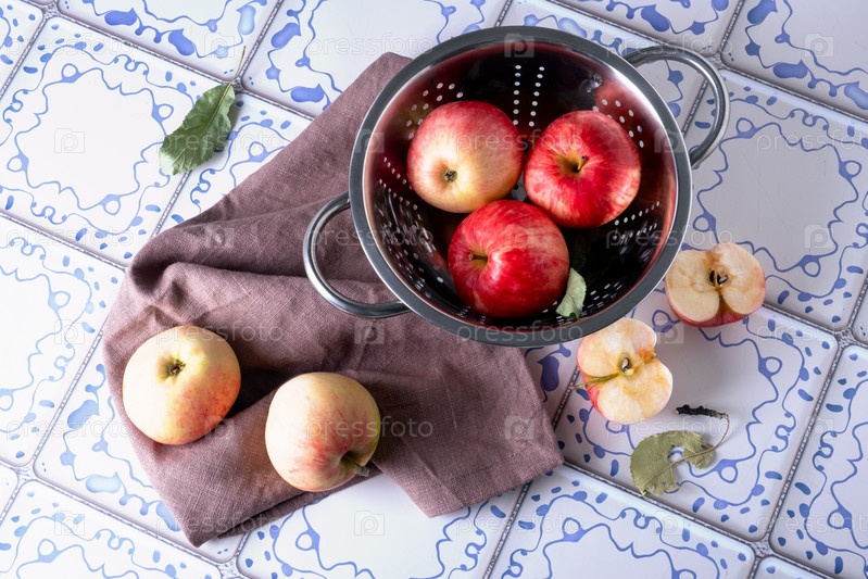 Красные яблоки лежат на льняной салфетке и в дуршлаге на столе