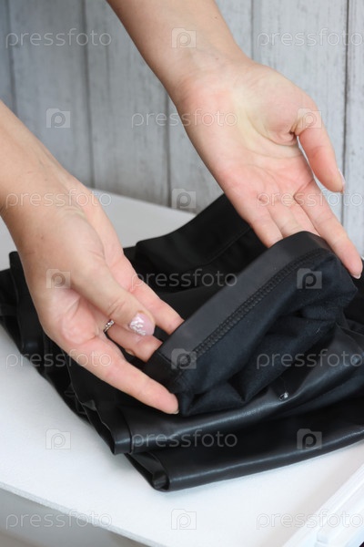 Женщина рассматривает и оценивает женские кожаные брюки. Она демонстрирует элементы дизайна