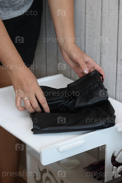 Женщина рассматривает и оценивает женские кожаные брюки