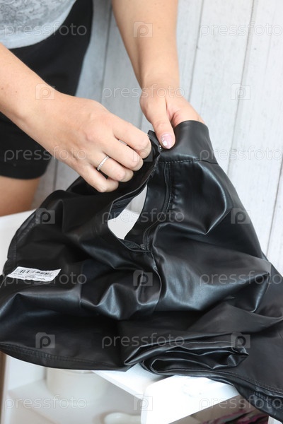 Женщина рассматривает и оценивает женские кожаные брюки. Она демонстрирует элементы дизайна