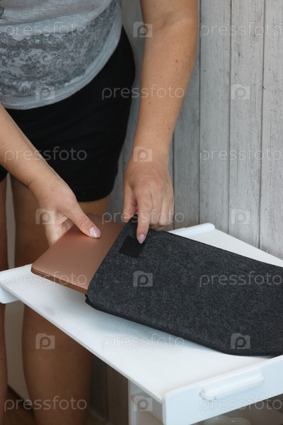 Женщина кладет ноутбук в фетровый чехол