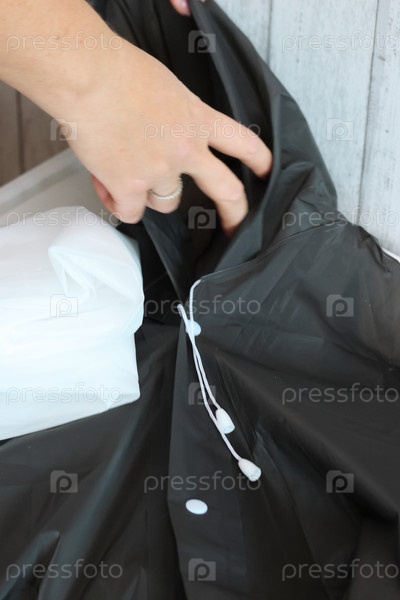 Женщина рассматривает и демонстрирует элементы плаща. Она рассматривает свою покупку