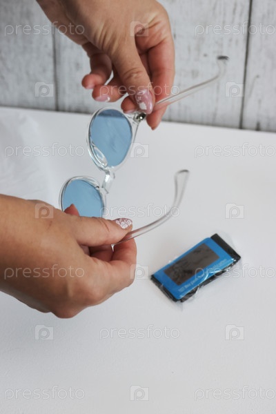 Женщина проверяет поляризацию солнцезащитных очков с синими линзами. Она рассматривает покупку на торговой площадке