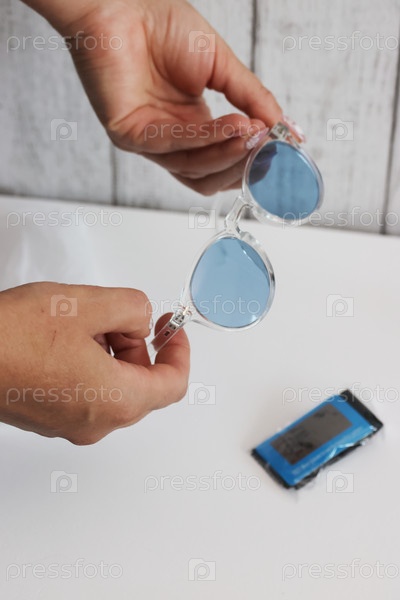 Женщина демонстрирует женские солнцезащитные очки с синими линзами. Она рассматривает покупку на торговой площадке