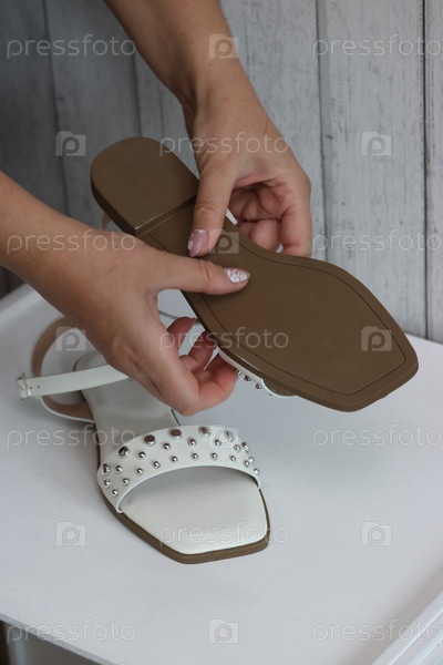 Женщина рассматривает покупку на торговой площадке. Женские летние сандалии