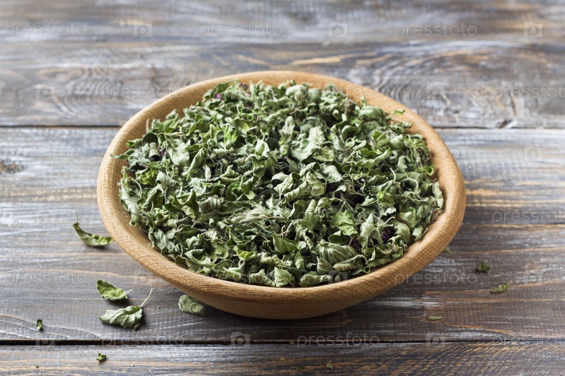 Сушеные листья орегано в деревянной миске на деревянном столе