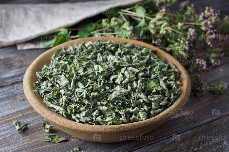 Сушеные листья орегано в деревянной миске на деревянном столе со свежим орегано, вид сверху, крупный план