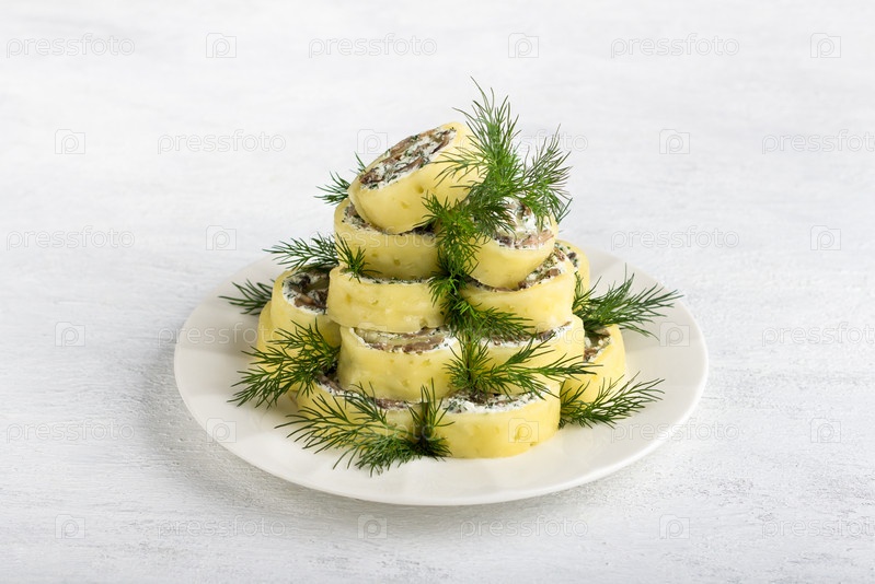Вкусный сырный рулет, фаршированный сливочным сыром, зеленью и грибами на белой тарелке в форме елки, украшенный зеленью на светло-сером столе