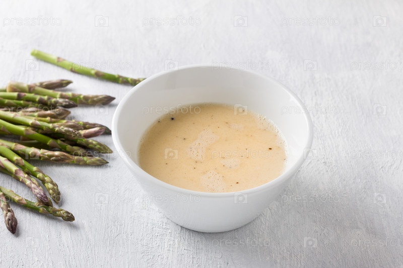 Белая керамическая миска со взбитыми яйцами с молоком и свежими побегами спаржи на светло-сером фоне. Готовим вкусный домашний омлет
