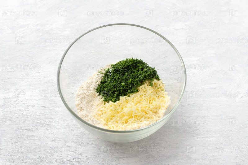 Стеклянная миска с манной крупой, тертым сыром и рубленой зеленью на светло-сером фоне. Готовим вкусную домашнюю вегетарианскую еду