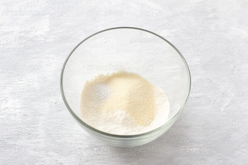 Стеклянная миска с манной крупой, мукой, содой и солью на светло-сером фоне. Готовим вкусные домашние торты
