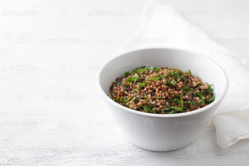Белая миска с вареной гречкой и капустой на сером фоне, вид сверху. Здоровая домашняя веганская еда