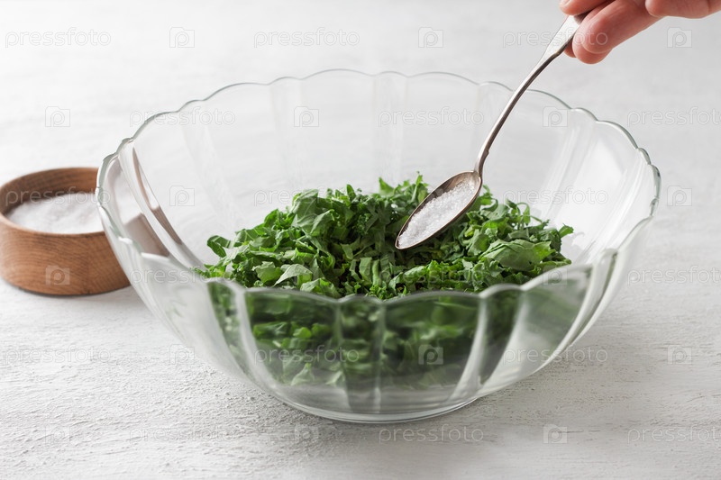 Нарезанная свежая зеленая кудрявая капуста в прозрачной салатнице с ложкой соли для приготовления полезного салата на светло-сером фоне, вид сверху, крупный план