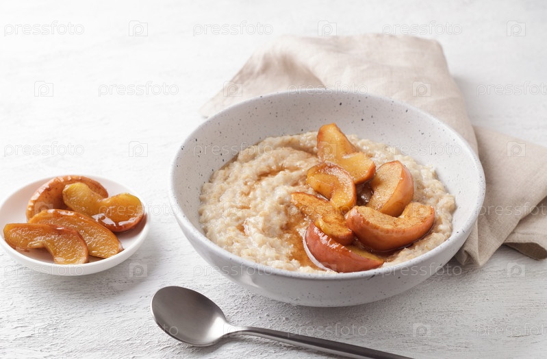 Сладкая овсяная каша с печеными кусочками яблок, корицей и карамельным соусом в серой миске на светлом фоне, вид сверху. Вкусная домашняя еда