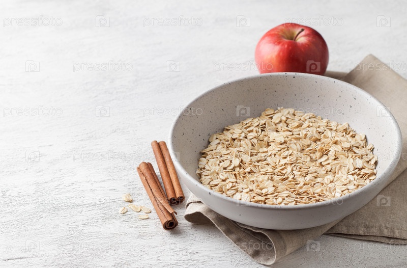 Сырые овсяные хлопья в керамической миске с палочками корицы и яблоками на светло-сером текстурированном фоне