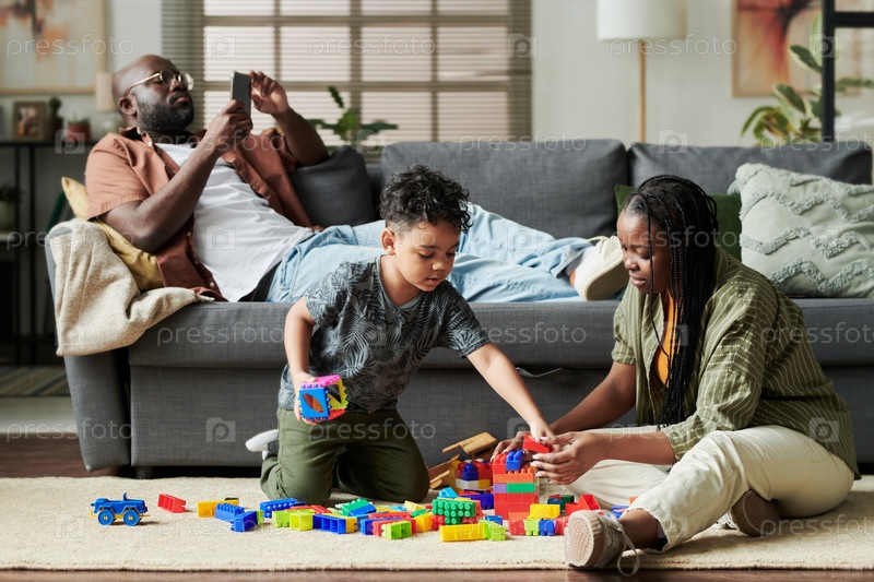 Играет в конструктора с милым маленьким сыном