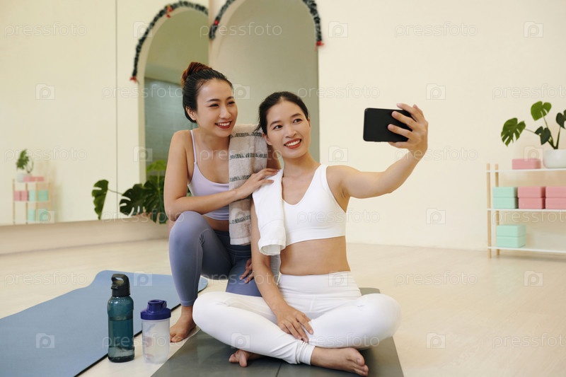 Две улыбающиеся женщины делают селфи во время занятий йогой