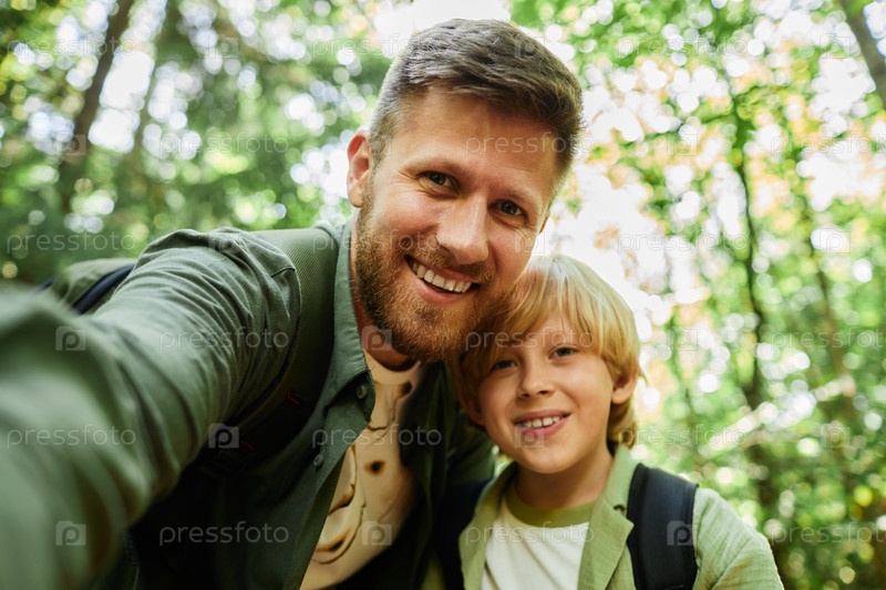 Улыбающийся отец и сын делают селфи природы в лесу