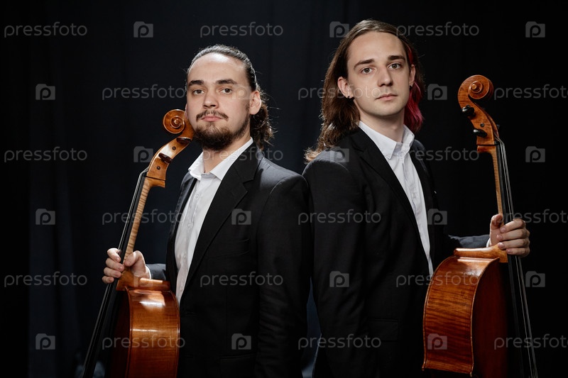 Художники классической музыки с виолончелью и контрабасом смотрят на камеру