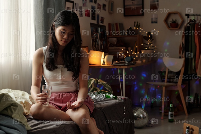 Печальная девушка со стаканом воды и таблетками