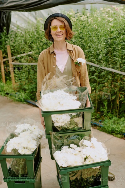 Улыбающаяся женщина устраивает свежерезанные цветы в теплице