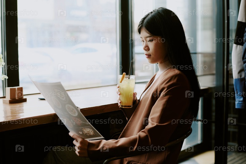 Чтение меню во время выпивки лимонада в уютном кафе