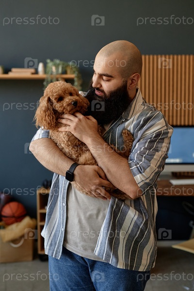 Мужчина держит коричневого пуделя в офисной обстановке