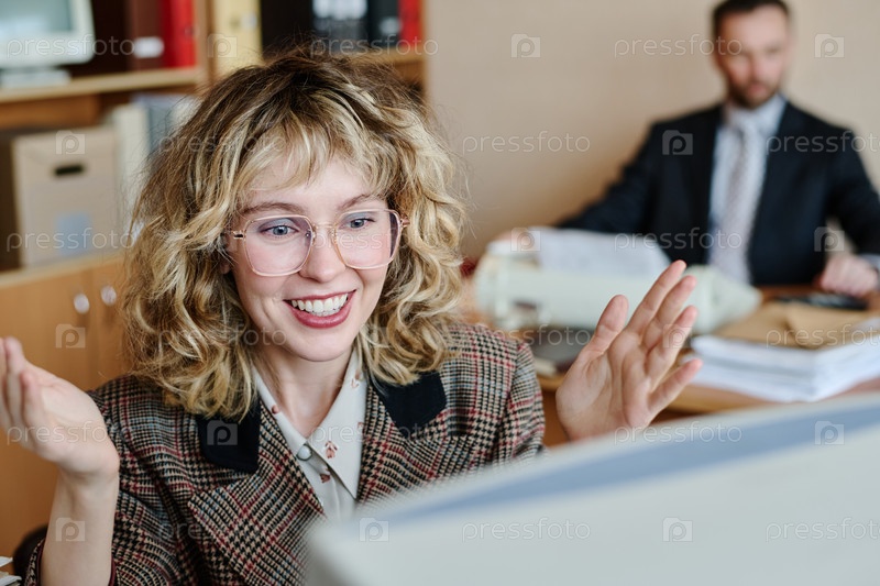 Улыбающаяся женщина с энтузиазмом жестикулирует в офисной обстановке