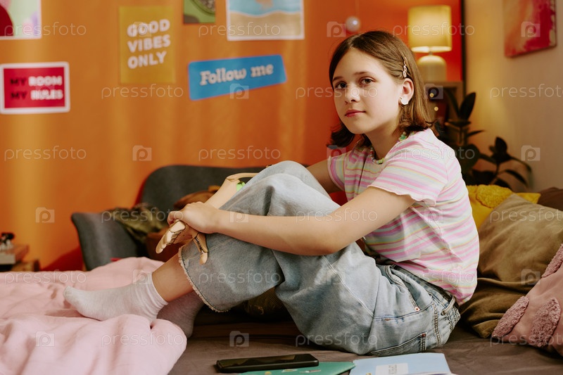 Стильная девушка, сидящая на кровати