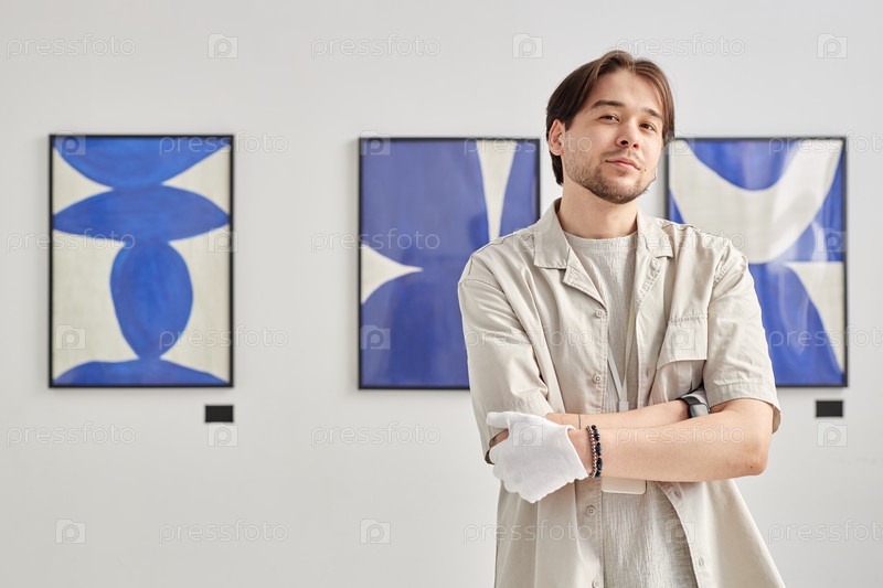 Человек как куратор художественной галереи, смотрящий на камеру
