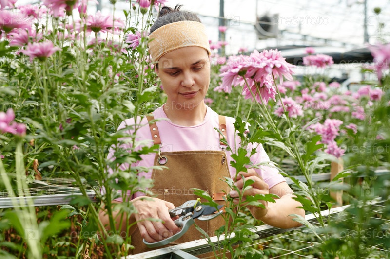 Улыбающаяся женщина работает на цветочной плантации, ухаживает за цветами и обрезает листья