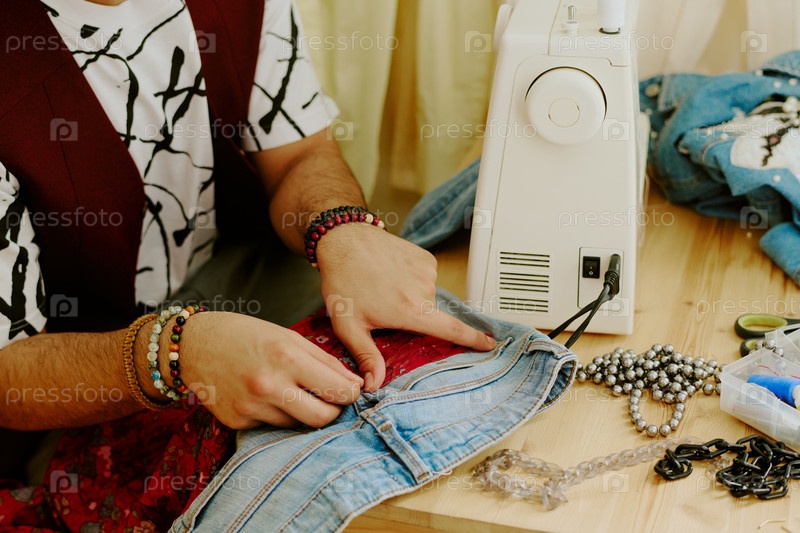Швейные руки изготавливают джинсы с помощью швейной машины