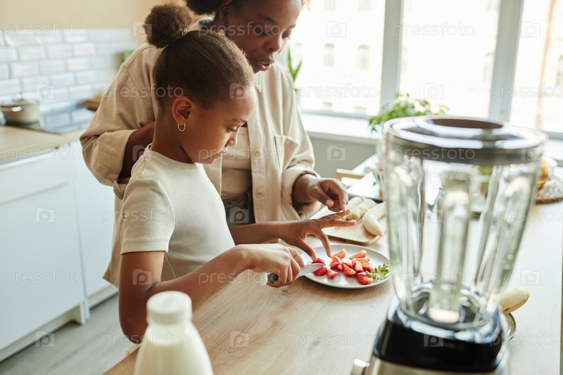 Афроамериканская мать учит ребенка готовить, резать клубнику